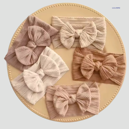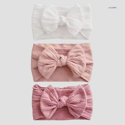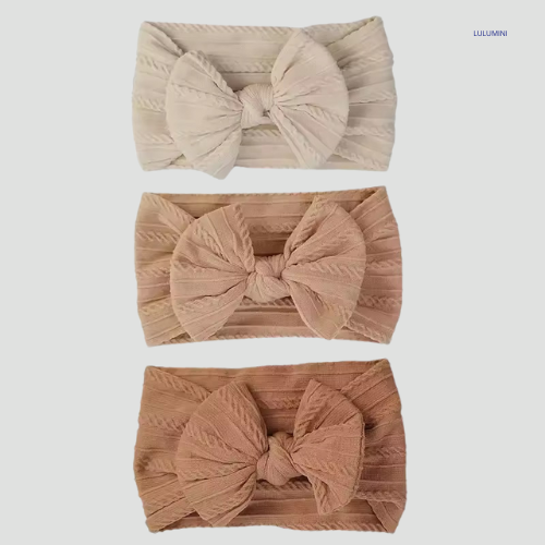 Drie keer zo schattig — set van 3 effen strik‑haarbandjes in zacht, rekbaar nylon. Deze elastische tulband‑stijl zit comfortabel op kleine hoofdjes en maakt elke outfit meteen lieflijker.