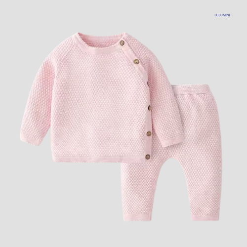 Deze schattige gebreide set, bestaande uit een zachte top en een bijpassende broek, is perfect voor kleintjes van 3-6 maanden tot 18-24 maanden. Gemaakt van 100% ademend katoen, biedt het ultiem comfort en bewegingsvrijheid. Ideaal voor dagelijks gebruik, met een tijdloos ontwerp en een fijne pasvorm. Een must-have voor elke baby!