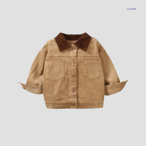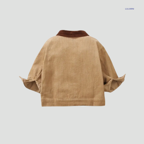 Onze Retro Jas, gemaakt van 100% katoen, is beschikbaar in beige met een bruine kraag. Deze stijlvolle jas biedt warmte en comfort, perfect voor een modieuze en gezellige look voor elk kind.